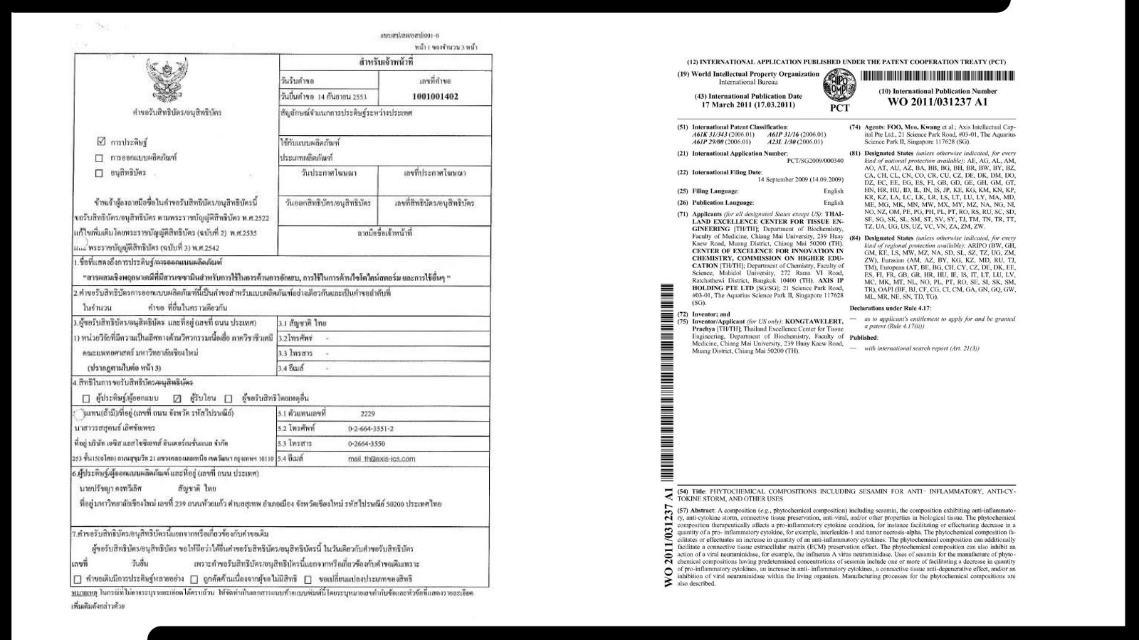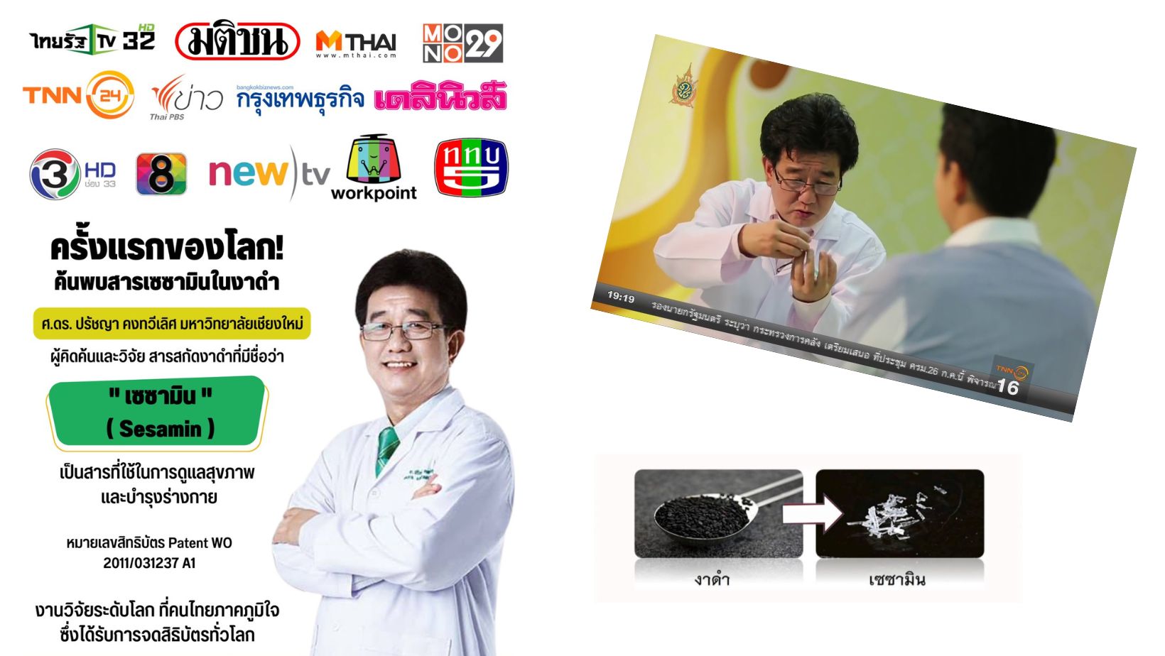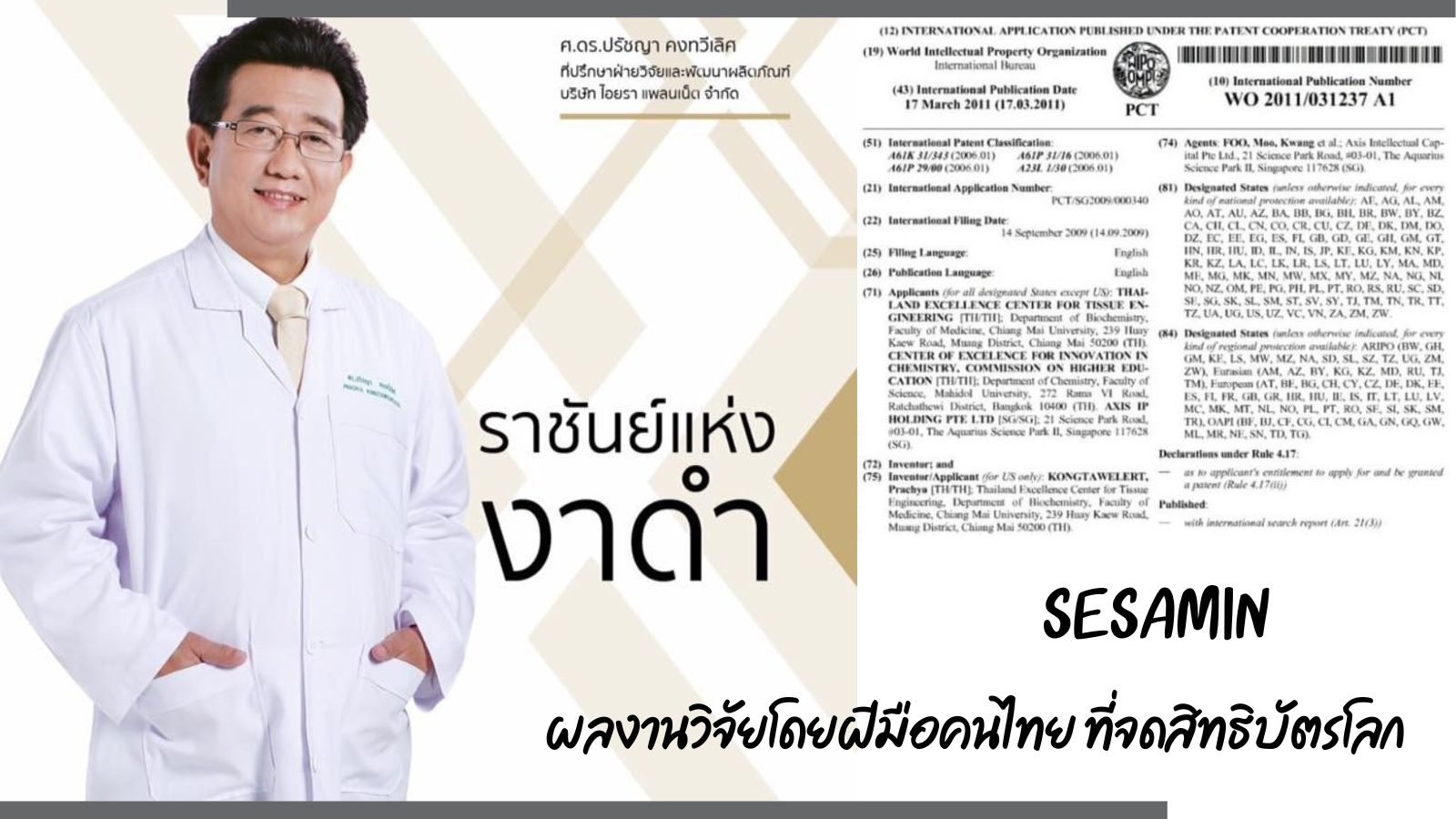 จากงาดำเมล็ดเล็กๆที่อุดมไปด้วยสารอาหาร สู่ผลงานศึกษาวิจัยของ ศ.ดร.ปรัชญา คงทวีเลิศ แห่งหน่วยวิจัยที่มีความเป็นเลิศทางด้านวิศวะกรรมเนื้อเยื่อและเซลล์ต้นกำเนิด แห่งมหาวิทยาลัยเชียงใหม่ ผู้ค้นพบคุณค่าอันเปี่ยมล้นด้วยสรรพคุณของเซซามิน ท่านได้พัฒนานำเอาเซซามินที่สกัดได้จากงาดำ ซึ่งปกติจะละลายในน้ำมัน มาทำให้สามารถละลายน้ำได้ เหมาะกับการทำเป็นผลิตภัณฑ์เสริมอาหารที่ร่างกายคนสามารถดูดซึมไปใช้ประโยชน์ได้โดยง่าย แล้วก็เติมสารสกัดจากพืชอื่นอีก 2 ชนิด เพื่อให้เซซามินสามารถออกฤทธิ์ได้ในระดับชีวโมเลกุลมีคุณสมบัติช่วยดูแลและส่งเสริมสุขภาพได้เป็นอย่างดี และทำการจดสิทธิบัตรไว้ในแบบผลิตภัณฑ์เสริมอาหาร ที่มีความปลอดภัยกว่าการใช้ยาเคมีทั่วไป