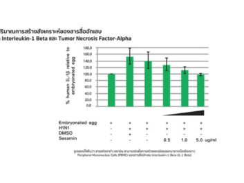 สามารถลดปริมาณการสร้างหรือการสังเคราะห์สารสื่ออักเสบชนิด Interleukin-1 Beta และ Tumor Necrosis Factor-Alpha ได้ ซึ่งเป็นผลจากการศึกษาวิจัย โดยการกระตุ้นเซลล์เม็ดเลือดขาวด้วยเชื้อไวรัสไข้หวัดใหญ่ H1N1 ซึ่งเป็นผลทำให้มีการหลั่งสารสื่ออักเสบเป็นจำนวนมากเพื่อจัดการกับสิ่งแปลกปลอม เรียกว่า พายุไซโตไคน์ กระบวนการนี้จะทำให้สารสื่ออักเสบที่มากเกินจำเป็นเหล่านี้ กลับมาทำลายเนื้อเยื่อปริเวณปอดของเจ้าของไข้เอง จนอาการแย่ลง แต่เมื่อได้รับสารสกัดเซซามิน (Sesamin) ร่วมด้วย จะทำให้มีการสร้างและปล่อยสารสื่ออักเสบ IL-1 Beta ออกมาลดลงอย่างเห็นได้ชัดเจน คนไข้ก็จะค่อยๆมีการฟื้นตัวดีขึ้น