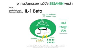 สารสกัดเซซามินบริสุทธิ์ สามารถยับยั้งการทำงานของสารสื่ออักเสบ ชนิด IL-1 Beta ได้ โดยการศึกษา ได้ทำการวิจัยในเซลล์กระดูกอ่อนที่ถูกกระตุ้นด้วย IL-1 Beta และเซซามิน (Sesamin) จากนั้นทำการศึกษาระดับโมเลกุลและพบว่า สารเซซามิน (Sesamin) สามารถยับยั้งการออกฤทธิ์ของ IL-1 Beta ได้ เป็นผลทำให้มีการลดลงของเอนไซม์ MMP13 ที่ไปย่อยสลายคอลลาเจนและสารชีวโมเลกุลอื่นในกระดูกอ่อน ได้อย่างชัดเจน