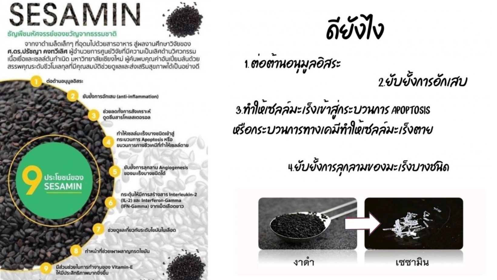 หลายคนอาจจะสงสัยว่า เซซามิน Sesamin จากงาดำเม็ดเล็กๆ นั้น มีคุณประโยชน์มากมายขนาดนั้นจริงๆ หรือ? จากงานวิจัย… ได้อธิบายกลไกการออกฤทธิ์ของสารเซซามิน Sesamin ที่มีต่อเซลล์มะเร็ง และมีการตีพิมพ์เผยแพร่ในวารสารระดับนานาชาติ